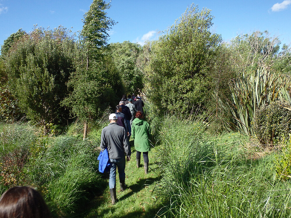 Despite the weather being cold and at times windy and wet, 30 hardy people set about exploring restoration sites in eastern Southland. The first stop was at Ruth and Monne Bruinsma’s farm at Kapuka. Ruth’s enthusiasm for the native riparian plantings and improving the natural habitat on their dairy farm was obvious. The work they started has been assisted through the DOC/Fonterra Living Waters programme. Cain Duncan, Fonterra, explained how they had funded further riparian plantings so that there would be connectivity between the remnants of forest on the Bruinsma property, along with the benefits to water quality. Ruth said they were also keen to improve fish access and habitat with regards to an old duckshooting pond close to the stream, which was recently surveyed for fish life, but showed no kokopu, koura or eels present. The next stop was at O’Neills Bush, on an Environment Southland lease block near the Titiroa River. Recollections were made of the early days when plantings were undertaken around the open north and east side there by the three local schools. Richard Bowman, ES Biosecurity Manager talked about the council’s recognition of the wetland and estuary edge values also found on these lower Mataura lease blocks and the intention to protect them further. The establishment of a Possum Control Area across the lease lands had seen over 2,000 possums removed this year and they were looking at mustelid, cat and rat control as well. During lunch at the Waimahaka Hall, we heard from Jesse Bythell, QEII National Trust representative for Southland. Also from Sheryll Ashton, Invercargill City Council, about the environmental focus that was going on in the city with Thomsons Bush, Anderson Park and the estuary, as well as significant plans for the ongoing restoration of Sandy Point. At Beggs Bush, Braid Rd, Fortification, we were met by the Beggs Bush Landcare Group members, a very dedicated team. This DOC forest reserve was donated to the people of New Zealand by Marie-Ellen Beggs father in the 1970’s and after years overseas, Marie-Ellen returned to check it out and decided there was work to do. An area at the entrance that had been planted out in pines, harvested about 6 years ago, with gorse taking their place, has been revegetated very successfully, thanks to the hard work of the group and others they have had give a helping hand, including Menzies College and the Toe Toe Lions Club. They are developing a rough track up in to the bush and are happy for people to explore their area there. The final stop was to the south end of the Wyndham Wildlife Refuge, where native plantings were started 25 years ago by local resident, Alan Leitch. A mown track through the plantings of ribbonwood, pittosporum, kowhai, coprosma, broadleaf, along with bulk plantings of flax, gave us a very pleasant end to the day as the weather cleared, and we wallked through basking in the warmth of the sunshine. Unfortunately lack of time prevented us from viewing the north end but we look forward to that next time. Thanks to all those who made the day possible, with special thanks to Environment Southland for sponsoring the bus.