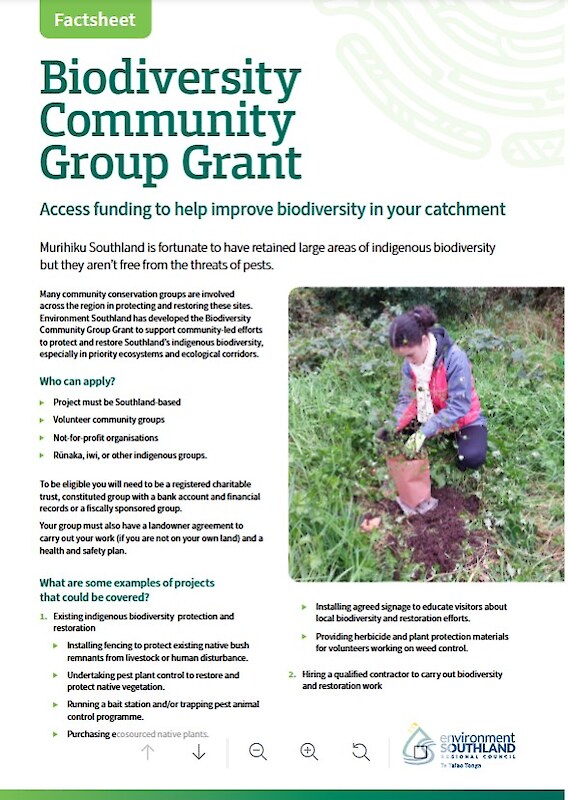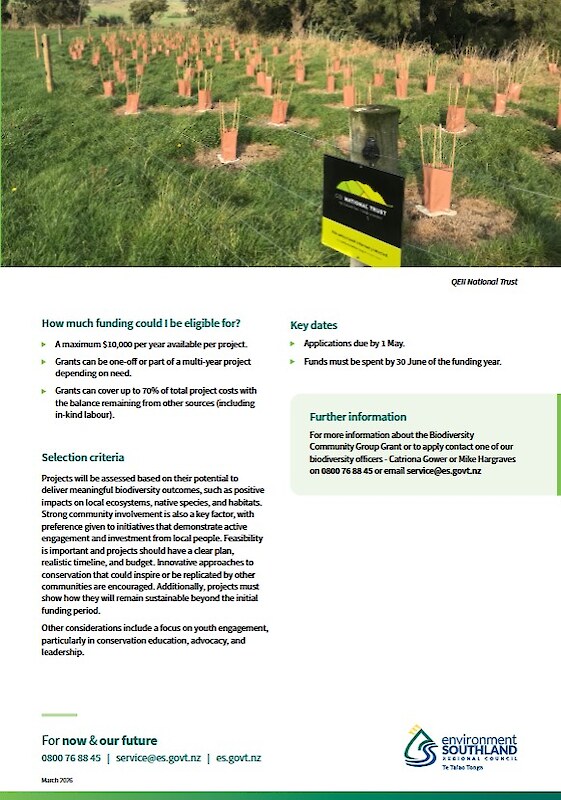 This fund manged by the Environment Southland Biodiversity Team, is open to community groups working anywhere in Southland to enahnce and protect biodiversity. There are more details and an online apploication form on the ES website Groups need to have an MOU with the landowner and be a constituted group with a bank account.